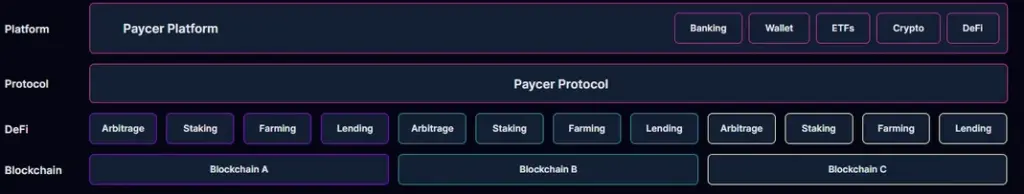 Paycer operates as a hybrid financial system that integrates blockchain-based protocols with conventional financial operations. The architecture is built around asset aggregation, allowing users to store, convert, and deploy funds across multiple financial layers.